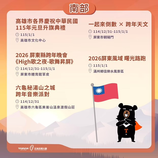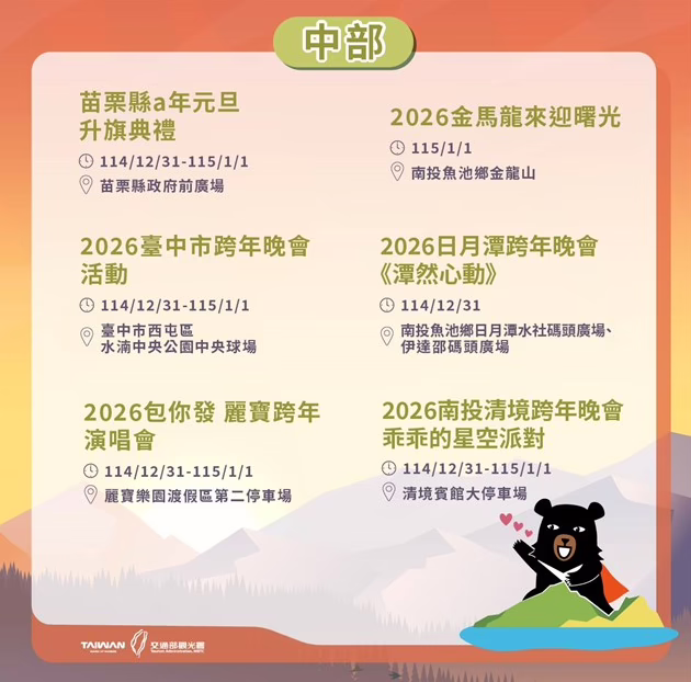 隨著 2026 年元旦即將到來,全台各地早已陸續規劃跨年與迎曙光活動。交通部觀光署也統整了國家風景區、主題樂園與各縣市政府的活動內容,從都會型跨年晚會、湖畔煙火、山城日出音樂會,到離島的戰地曙光與升旗健行,總計超過 40 多場特色活動,讓旅人能依照喜好自由選擇。