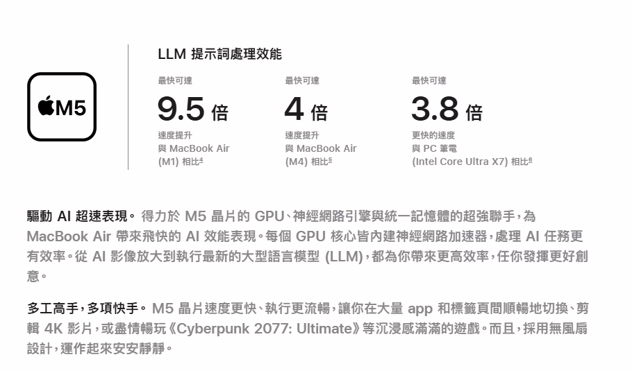 如今市場的焦點逐漸轉向 M5 MacBook Air。隨著 Apple 持續推進 3 奈米製程與 AI 加速架構,M5 不只是單純的性能升級,更可能象徵 Mac 行動平台的新階段。特別是在 AI、圖形運算與資料處理需求快速成長的背景下,一台輕薄筆電是否能同時提供強大效能,成為許多使用者關注的核心問題。
