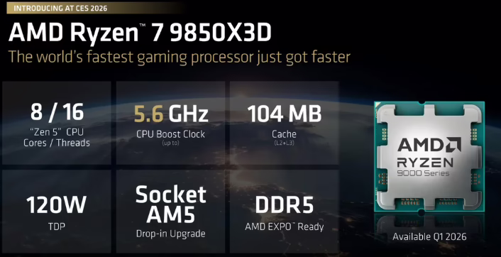 Ryzen 7 9850X3D 在 CES 2026 正式亮相,維持 8 核心 16 執行緒、120W TDP 的架構,並把最高 Boost 時脈推到 5.6GHz,相較 9800X3D 的 5.2GHz 增加 400MHz。AMD 也用多款遊戲(如 Baldur’s Gate 3)對比 Intel 的 Core Ultra 9 285K,喊出最高可達 60% 的領先幅度,明確把它定位成「更快的遊戲神 CPU」。